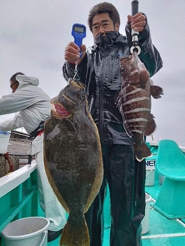 午前船 ヒラメ狙い 釣果 ヒラメ3枚1.8〜3.2Kg ソゲ4枚 マハタ4本 アオハタ1本 赤ヤガラ2 5時30分出船 マズメ〜11時まではソゲとゲストでしたが オーラス30分間で1.8 2.1 3.2Kgゲット👍 素晴らしいマクリでした✨